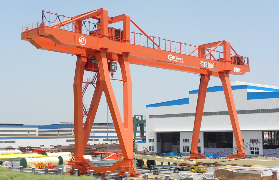 門式起重機是橋式起重機的一種變形,又叫龍門吊。主要用于室外的貨場、料場貨、散貨的裝卸作業(yè)。它的金屬結(jié)構(gòu)像門形框架,承載主梁下安裝兩條支腳,可以直接在地面的軌道上行走,主梁兩端可以具有外伸懸臂梁。門式起重機具有場地利用率高、作業(yè)范圍大、適應(yīng)面廣、通用性強等特點,在港口貨場得到廣泛使用。