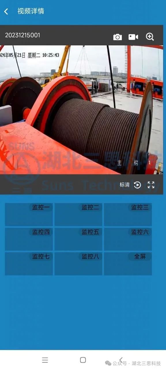 視頻監(jiān)控系統(tǒng)監(jiān)測桅桿吊的起升卷揚、變幅卷揚、吊裝區(qū)域,視頻顯示器放置于駕駛室中,給駕駛員帶來更加寬廣的操作視野,提高了桅桿吊操作便捷性。