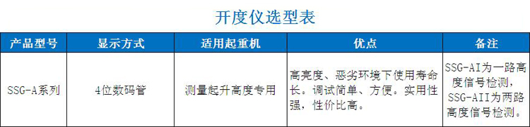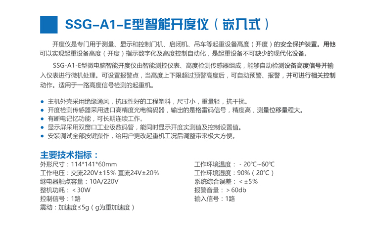 SSG-AⅠ-E型微電腦智能開度儀由智能測(cè)控儀表、高度檢測(cè)傳感器組成,能夠自動(dòng)檢測(cè)設(shè)備高度信號(hào)并輸入儀表進(jìn)行微機(jī)處理??稍O(shè)置報(bào)警點(diǎn),當(dāng)高度上下限超過預(yù)警高度后,可自動(dòng)預(yù)警、報(bào)警,并可進(jìn)行相關(guān)控制動(dòng)作。適用于一路高度信號(hào)檢測(cè)的起重機(jī)。