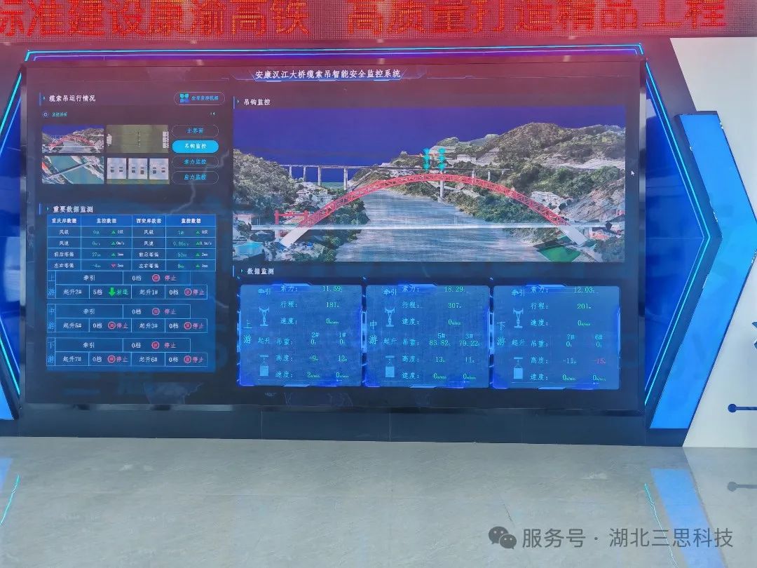 廣西漓江特大橋全長717米,其中主橋為190米下承式鋼管混凝土系桿拱橋,單條拱肋分為8個節(jié)段,全橋共16個節(jié)段,最長節(jié)段約29.64米,最重節(jié)段達67.84噸,是整個桂林外環(huán)高速項目的重要組成部分。拱肋節(jié)段采用“纜索吊裝+斜拉扣掛”施工工藝進行安裝,建造難度大、技術水平要求高。本纜索吊安全監(jiān)控系統(tǒng)采用的是由湖北三思科技依據(jù)國標《起重機械安全監(jiān)控管理系統(tǒng)》GB/T28264-2017相關規(guī)定自主研發(fā)的SSL-CB型纜索吊安全監(jiān)控管理系統(tǒng),監(jiān)測纜索吊的起吊、牽引索力,運行行程數(shù)據(jù),起升高度數(shù)據(jù),限位數(shù)據(jù),操作指令數(shù)據(jù)以及輸出控制點位,可以讓駕駛員全方位掌握纜索吊的實時運行狀況,提高了操作的安全性。