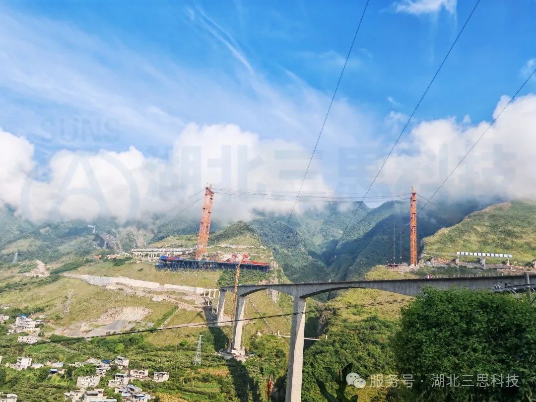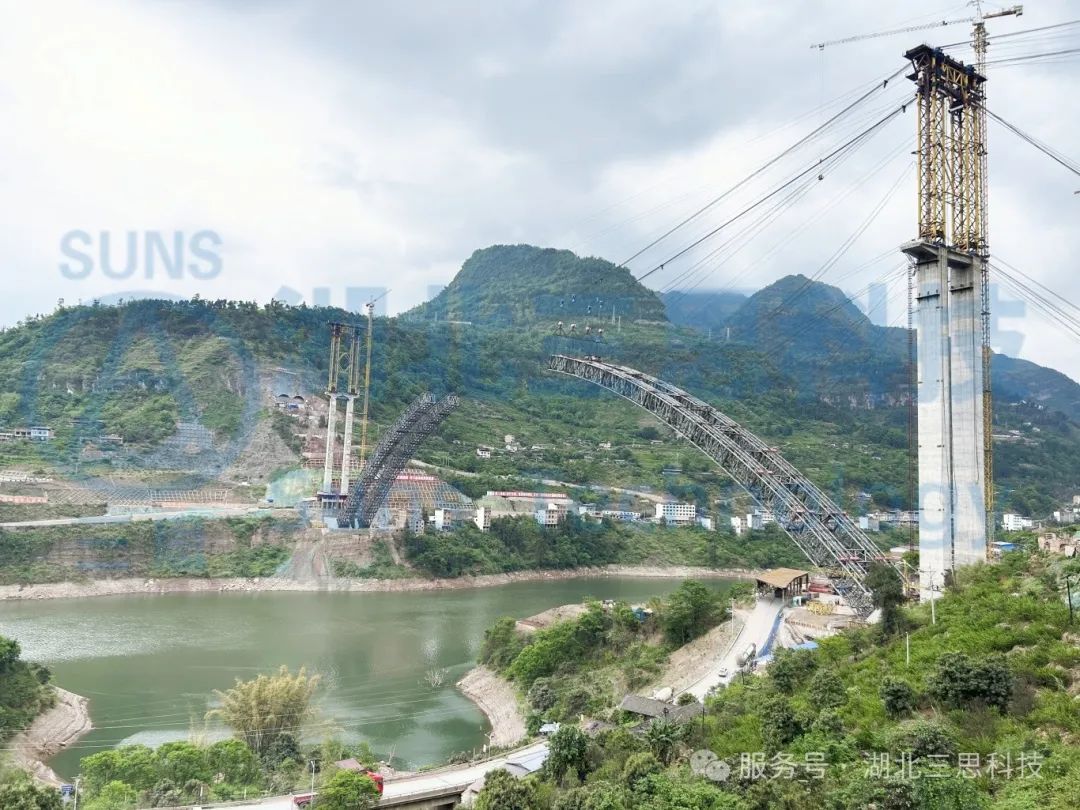 北流河特大橋主拱采用鋼管混凝土四肢全桁式結構,整束擠壓鋼絞線吊索體系,主拱計算跨徑為270m ,計算矢高 67.5m。北流河特大橋采用貝雷桁架主塔結構,吊扣一體化纜索吊體系。其中北塔高101.8m,南塔高105.8m,起重能力為2×95t,創(chuàng)同類型纜索吊高度國內(nèi)第一,同高度吊重國內(nèi)第一的“雙創(chuàng)”紀錄。5月30日,由湖北三思科技參與的北流河大橋纜索吊集中控制系統(tǒng)正式亮相荷載試驗。本系統(tǒng)的成功運用,將大幅提升施工安全系數(shù),有力保障了吊裝作業(yè)零失誤。
