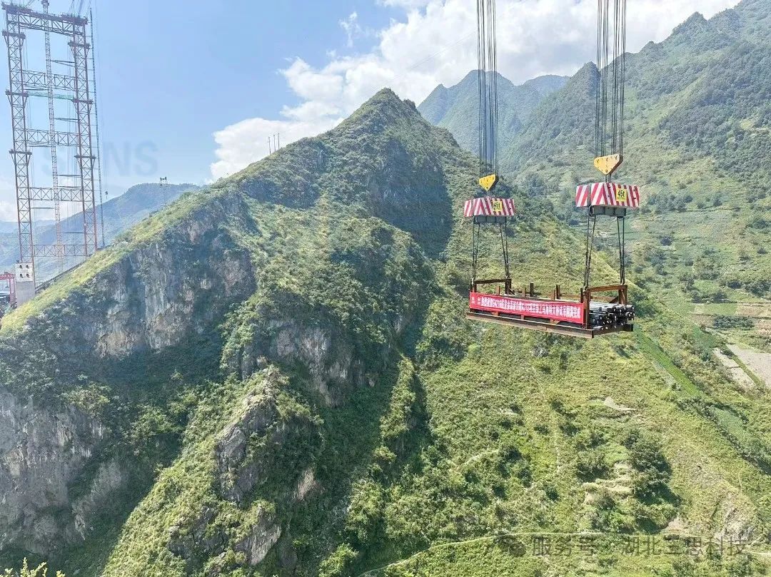 大河溝特大橋位于宜賓市屏山縣新市鎮(zhèn)境內(nèi),是一座跨徑為293.4米的鋼管混凝土中承式拱橋,主拱拱肋共64個節(jié)段,拱圈總計用鋼量約3300噸。大河溝特大橋為U型峽谷間的隧間橋,由于所處地勢陡峭險峻,施工建設面臨三大挑戰(zhàn)。一是拱座處于近90度垂直峭壁,機械設備無法開展作業(yè),前期進場施工困難;二是大橋起吊高度距谷底高差約為230米,纜索吊裝系統(tǒng)施工困難;三是運輸?shù)缆房v坡有6處大于16%,最大縱坡可達21%,運輸構件總高度達到8米,構件運輸?shù)缆防щy。為確保大河溝特大橋右線主拱順利實現(xiàn)合龍,項目建設團隊全力推進技術攻關工作。一是工藝新,運用先栓后焊的工藝,實現(xiàn)了全橋臨時螺栓全連接,以工藝創(chuàng)新實現(xiàn)精準對接。二是結構新,采用“單側索塔+兩岸錨碇”形成獨塔雙跨吊裝系統(tǒng),創(chuàng)造性地依據(jù)地形特征量身定制施工方案。三是系統(tǒng)新,使用由湖北三思科技自主研發(fā)的智能纜索吊智能集中控制系統(tǒng),通過APP遠程控制纜索吊實現(xiàn)拱肋一鍵吊裝到位,提高了吊裝系統(tǒng)的高效性。